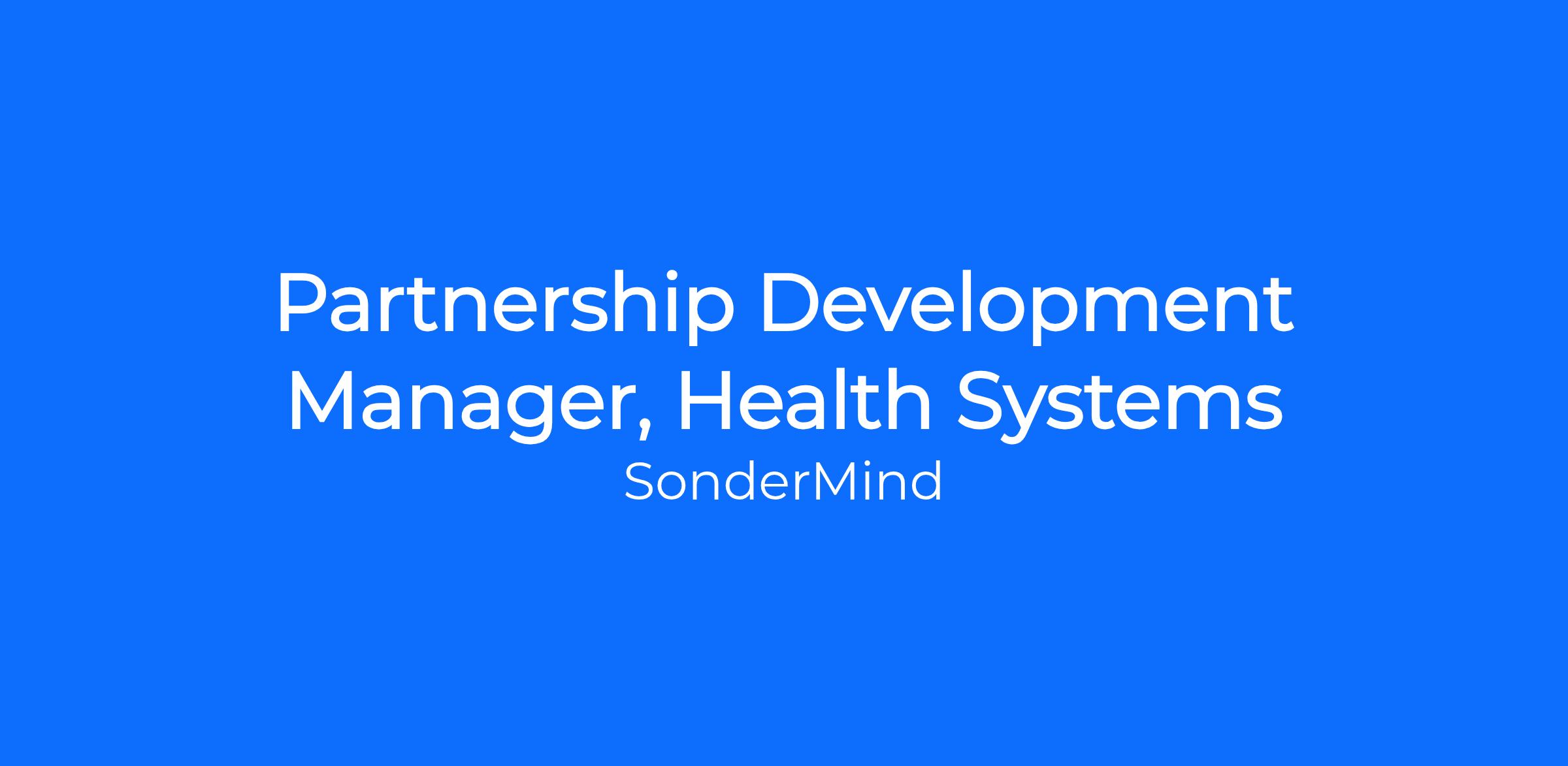 SonderMind is seeking a Partnership Development Manager, Health Systems to own the entire lifecycle of health system partnership development. This role is responsible for identifying, engaging, qualifying, and activating new health system referral partnerships, from initial outreach through referral readiness and early referral flow.